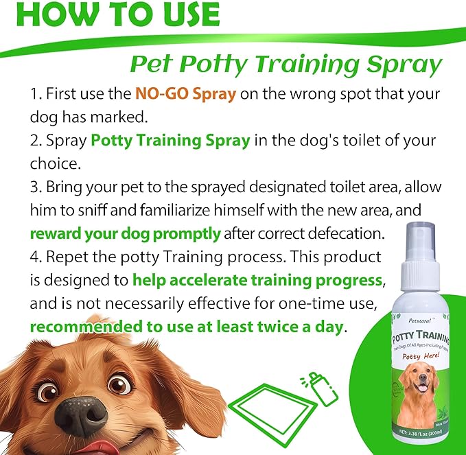 • 【Training Everywhere, Easy to Use】Whether you use it indoors, outdoors, on a puppy training mat, artificial grass or dog pee post, simply use the No-Go Training Spray where you don't want your pet to go, and Potty where you want your pet to defecate! Training Spray, combined with hand signals and rewards, can quickly train your pet.