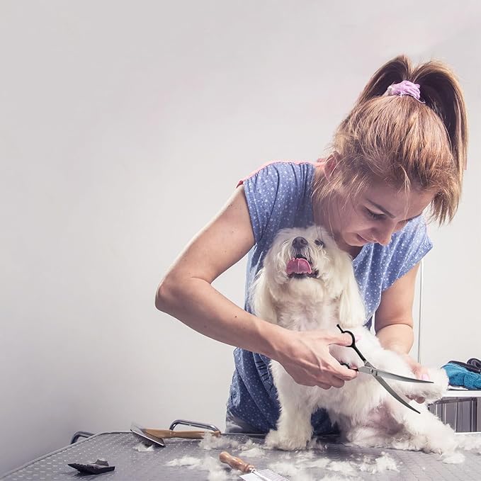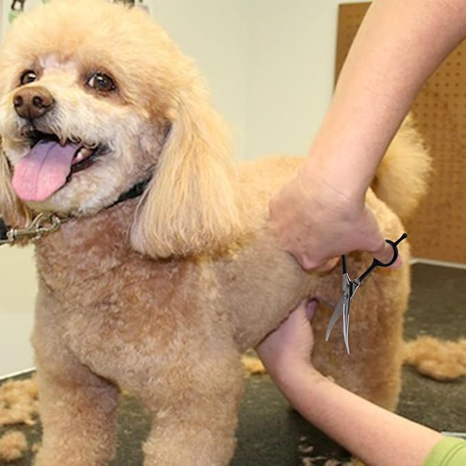 • MULTIFUNCTIONAL – Measuring 7 inches with 3.38-inch blades, these professional curved grooming scissors are ideal for use in pet hospitals, salons, and at home. They’re suitable for grooming sensitive areas such as eyes, face, ears, paws, and head, making them a versatile tool for both dogs and cats.