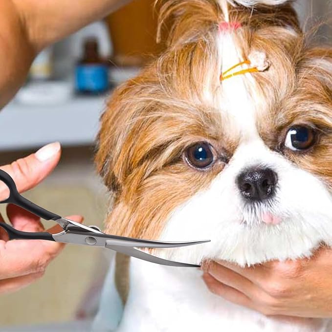 • MULTIFUNCTIONAL – Measuring 6 inches with 2.5-inch blades, these professional curved grooming scissors are ideal for use in pet hospitals, salons, and at home. They’re suitable for grooming sensitive areas such as eyes, face, ears, paws, and head, making them a versatile tool for both dogs and cats.