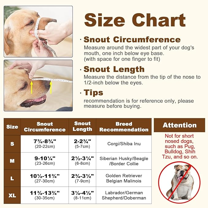 - Available in Size XL: The extra large dog muzzle is suitable for dogs with a snout circumference of 11¾-13¾". The muzzle for extra large dogs is fit for Labrador, German Shepherd, German Shorthaired Pointers and so on. To make the dog muzzle small breed fit your dog perfectly, please measure the size before buying soft dog muzzles for large dogs.