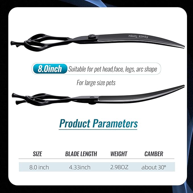 • Features: This pet curved scissors are available in 8.0 inches with ergonomic handles, suitable for most people. Finely polished, frosted surface, fine metal texture. precise adjustable screws effectively prevents screws from loosening due to prolonged use
