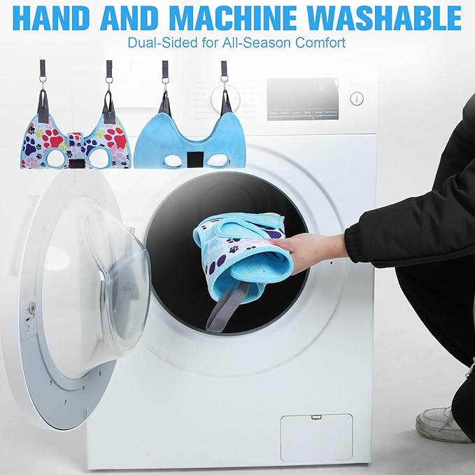 • COMFORTABLE AND WASHABLE: Soft material with thickened edges makes this pet grooming sling increase comfort and sturdiness. In addition, dog restraint grooming bag has an upgraded wider under body support and larger frontal chest/neck space. And our heavy-duty carabiners with better weight bearing. Our dog harness for nail trimming can be machine washed