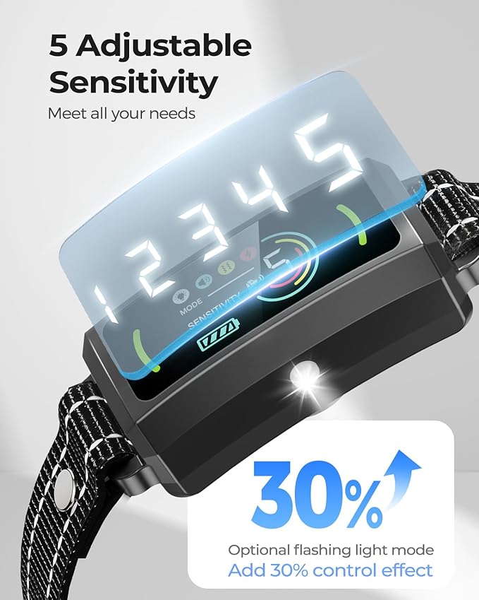 • 5 Humanized Modes: The GAJUX dog bark collar offers 5 training modes: beep, vibration, beep + vibration, safe shock, and a flashing light feature for an additional 30% control effect. With adjustable sensitivity levels ranging from 0 to 5, you can easily customize the level of stimulation that works best for your furry friend, which is helpful in deterring dogs from undesirable habits