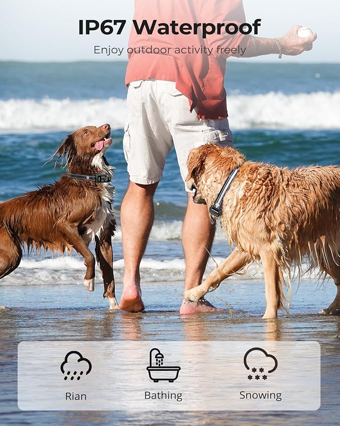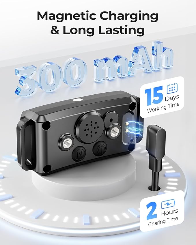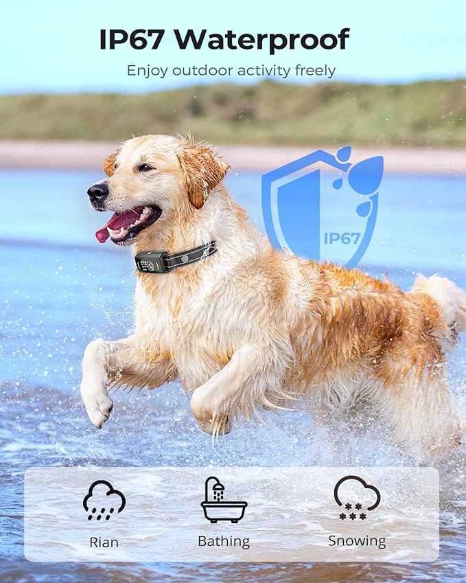 • Long Battery Life & IP67 Waterproof Design: The bark collar for large dogs fully charges in just 2 hours and lasts up to 15 days on a single charge. With an IP67 waterproof rating, it's perfect for training sessions by the pool, at the park, on the beach, or in your backyard, no matter the weather