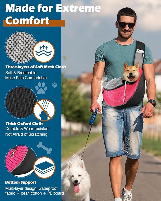• Multiple Pockets: Dog carrier sling has zippered pocket on the back that can be used for daily supplies. The shoulder strap side pocket can be used to place mobile phones within 6.1 inches, and the D-buckle can be used to hang foldable bowls, keys, and other small items. With strong storage performance, the dog carrier bag is designed with the right mesh pocket.