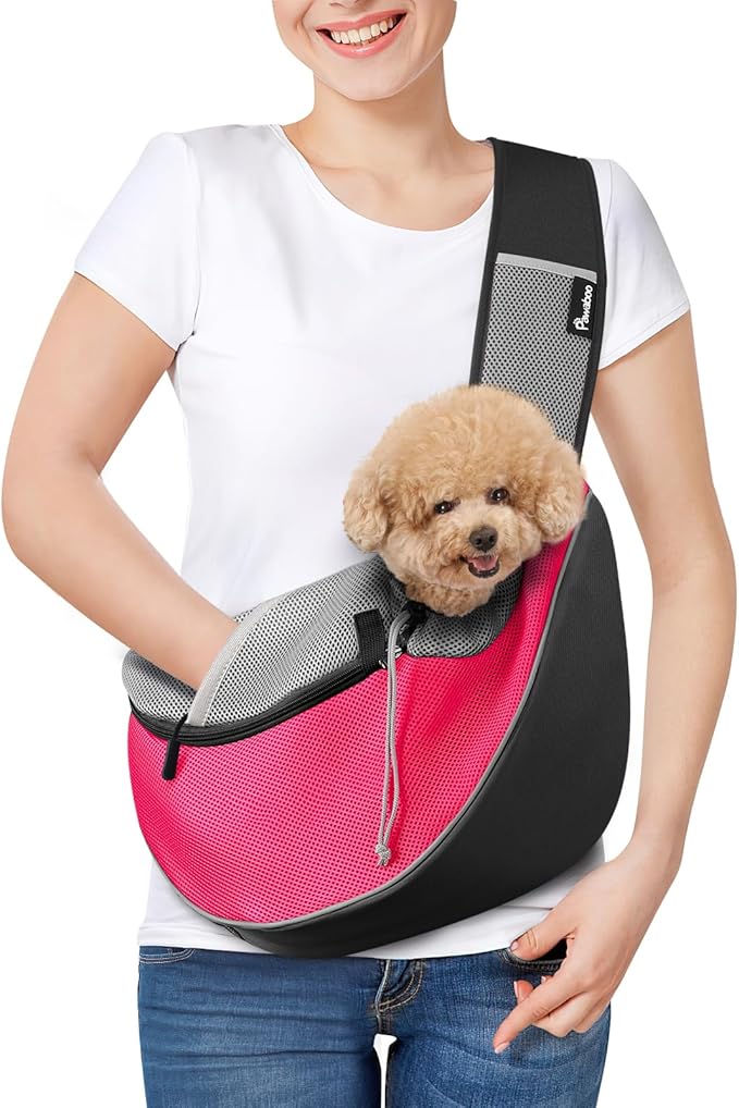 Pawaboo Dog Sling Carrier, Dog Papoose with Zipper Touch Pocket, Hand Free Breathable Mesh Puppy Carrier, Crossbody Satchel Dog Purse with Adjustable Strap for Outdoor Travel, Pink, Medium