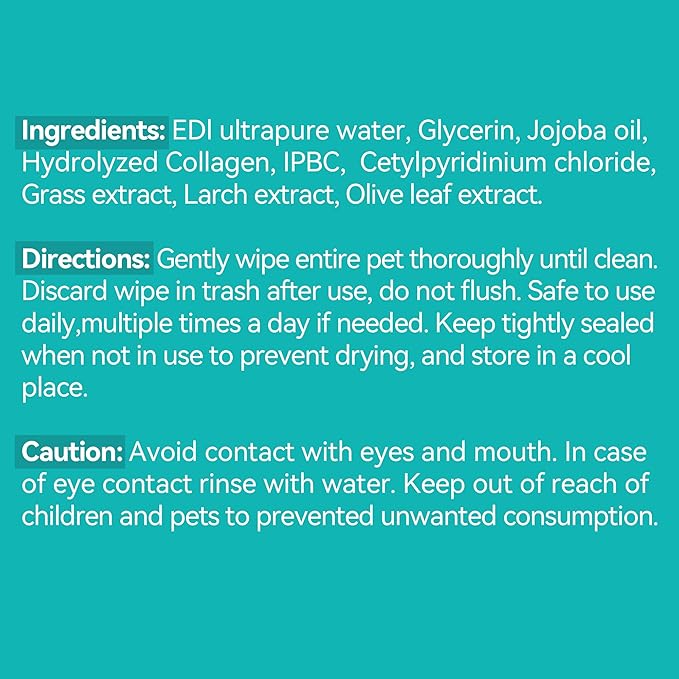 • Multipurpose Grooming Wipes: Ideal for cleaning paws, body, face, ears, belly, and rear end of your furry friend.