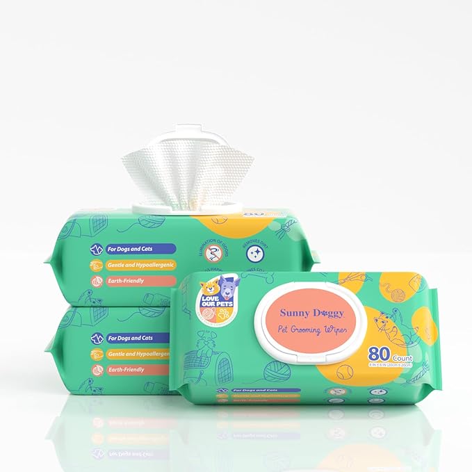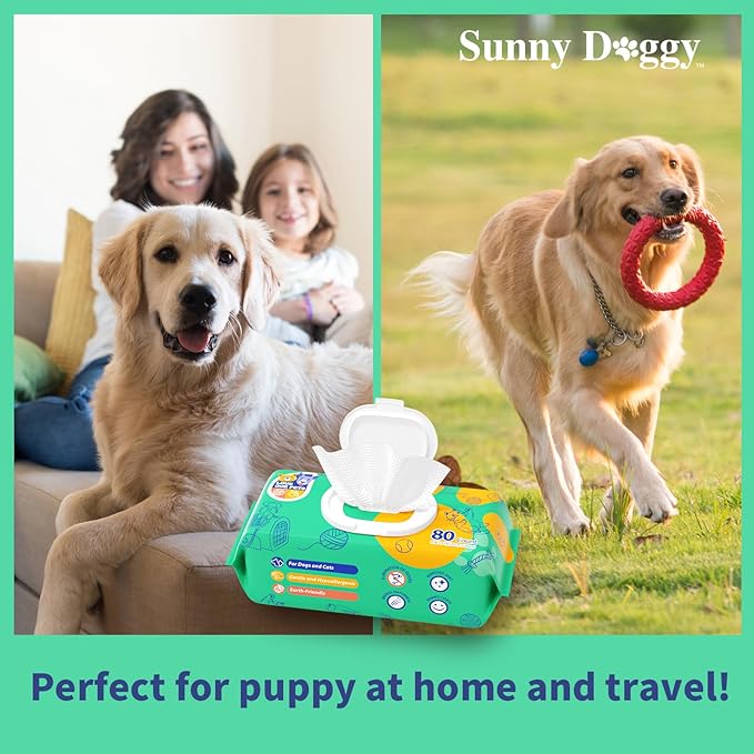 • PET WIPES FOR DOGS AND CATS: Sunny Doggy Pet Wipes are the ones that not only deodorize effectively, but also clean stains from your pet quickly and easily. The pet cleaning wipes can be used on your pet's butt, paws, ears, fur and around the eyes. Very gentle on pets.