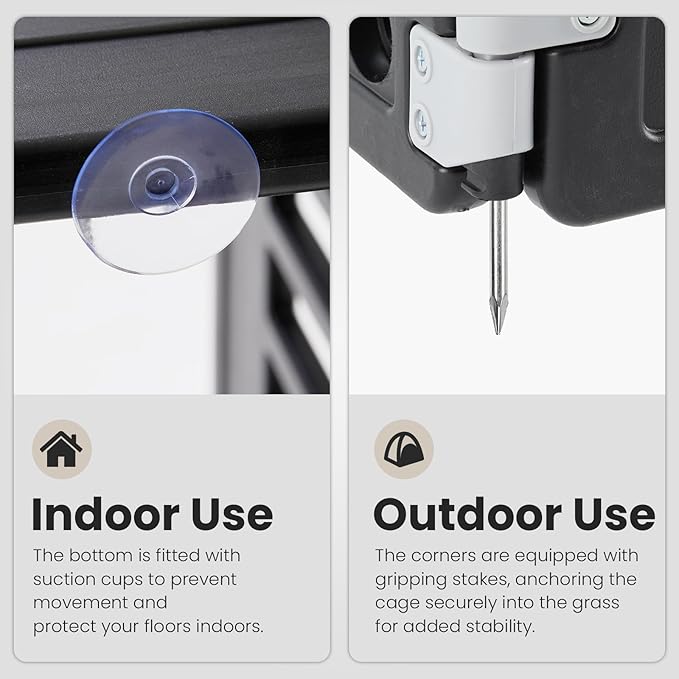 • Enhanced Stability for Indoor and Outdoor Use: For indoor use, each panel is equipped with two suction cups, ensuring the playpen stays firmly in place on smooth floors and preventing movement or wobbling. When outdoors, the included ground pegs (5 for 4-panel sets, 7 for 6-panel sets) provide additional stability on grass or soil. Please note that prolonged outdoor exposure may affect the material’s durability.