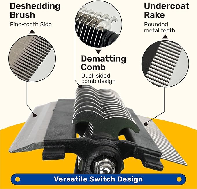 • 【Versatile Switch Design】 The innovative design allows easy switching between the dematting rake and smoothing comb, adapting to various grooming needs. The dual-sided comb features wide teeth for loosening tough knots and fine teeth for detailed grooming, effectively removing loose hair and tangles.