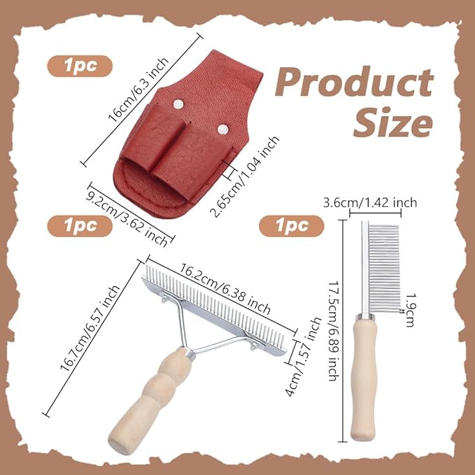 • Size Details--The size of rake pet comb is 167x162x40mm/6.57x6.38x1.57 inch, the size of single side pet comb is 175x36x19mm/6.89x1.42x0.75 inch, the size of leather storage is 60x92x26.5mm/2.36x3.62x1.04 inch