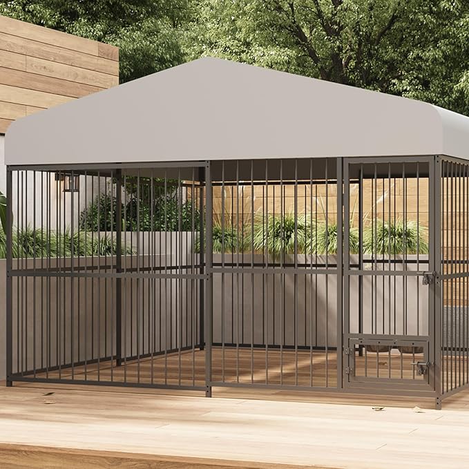 - [ENHANCED SECURITY FOR PEACE OF MIND] Safety is our top priority, which is why this dog kennel outside is equipped with a well-designed lock on the door. This security mechanism effectively keeps potential predators at bay while ensuring that your pets are secure within their enclosure. With this added protection, you can let your dog play happily without worry, knowing they are safely contained and protected from external threats.