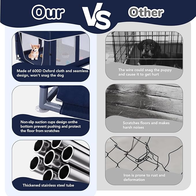 • EXCELLENT MATERIAL - Our puppy play pen indoor is made of wear-resistant 600D Oxford cloth, breathable and visible mesh and thickened stainless pipe. It provide a sturdy and safe environment for small dogs, small animals.