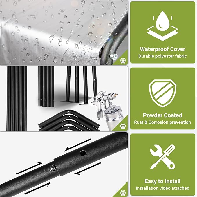 • Sturdy Construction: The frame of the pet shade is made of steel tubing with a powder coated finish that prevents the pet shade from rusting and corroding. It is strong enough to withstand any outdoor conditions for years to come