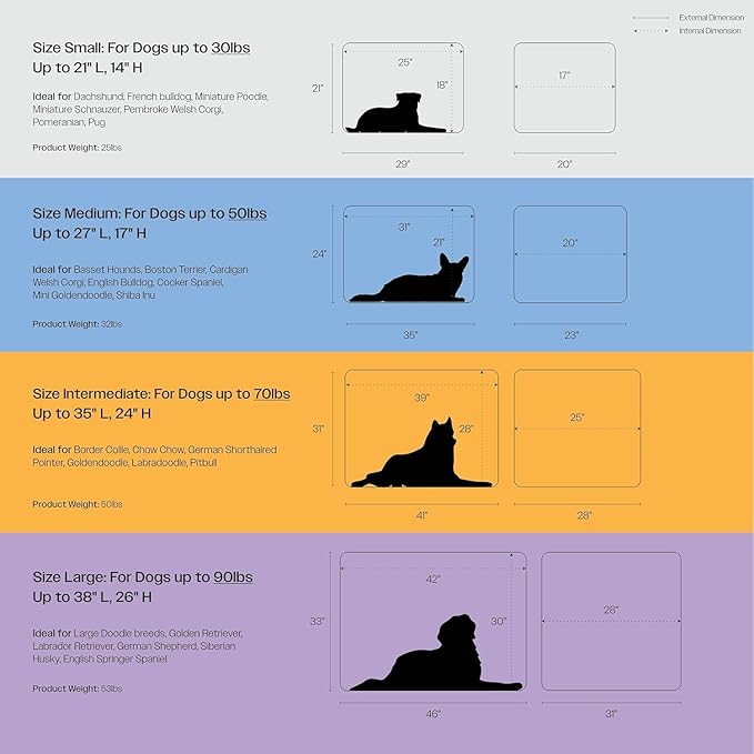 • IS THIS THE RIGHT SIZE FOR MY DOG?: Ideal for dogs up to 17" tall, such as Dachshunds, French Bulldogs, Miniature Poodles, Miniature Schnauzers, Pembroke Welsh Corgis, Pomeranians, and Pugs. Internal dimensions: 25"L x 17"W x 19"H. External dimensions: 28"L x 20"W x 21"H.