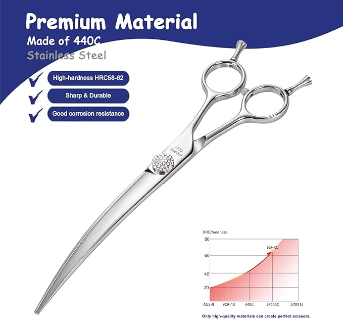 • Material:Our scissors use real high-quality Japanese 440C stainless steel, and because of this stainless steel, our scissors are very durable and sharp. You will find that the feel of our scissors will be better than most ordinary scissors on the market, even other 440c scissors after you use them.