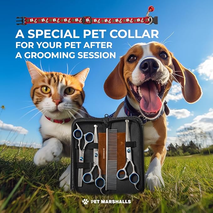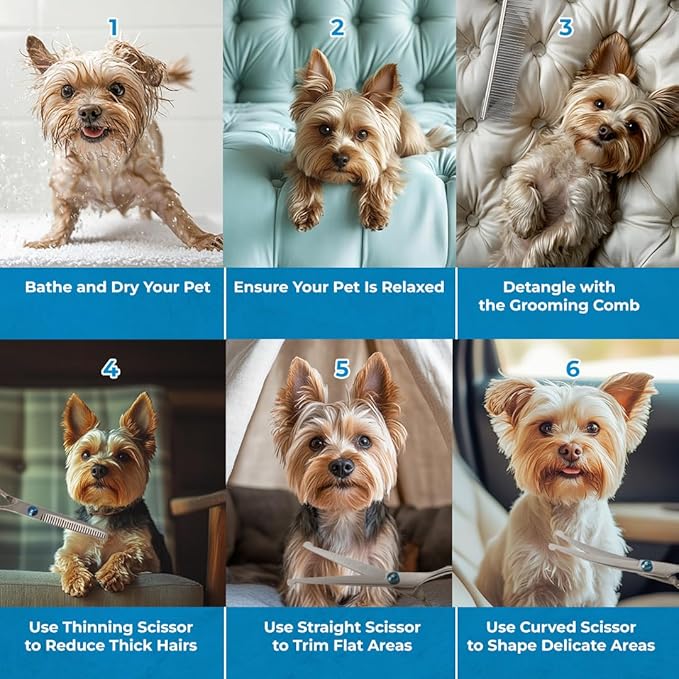 • VERSATILE TOOLS: Set includes thinning shears, straight scissors, curved scissors, and a metal comb for all your pet grooming needs