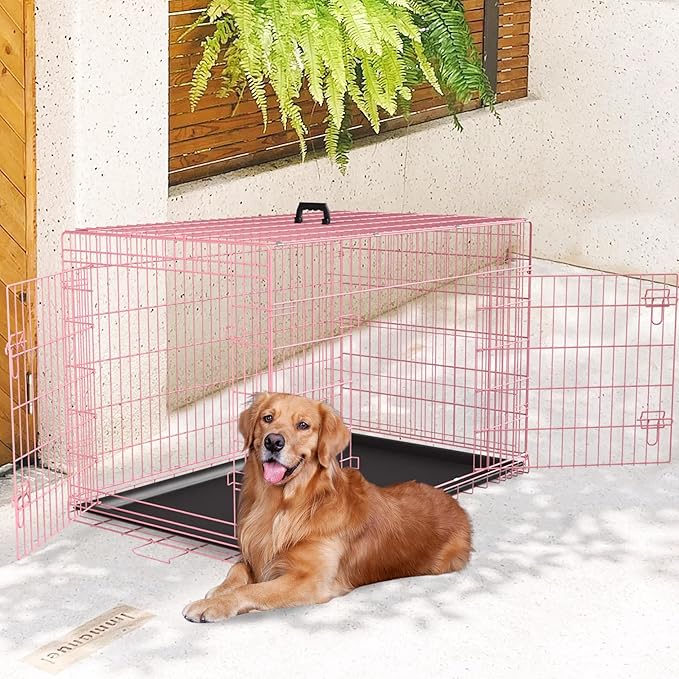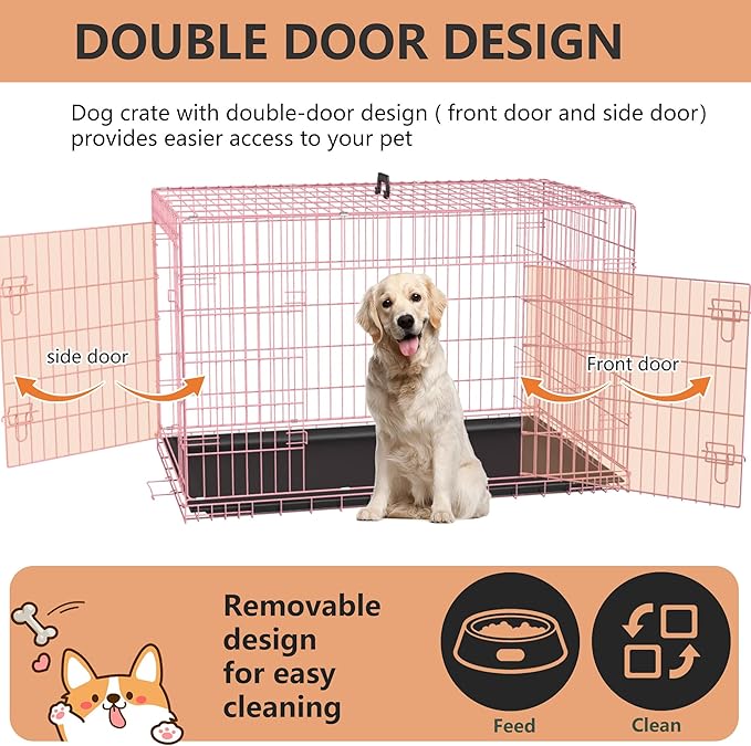 FDW Dog Crate for Large Dogs 42 Inch Folding Metal WirePet Cage Double Door W/Divider Panel Indoor Outdoor Kennel Leak-Proof Plastic Tray,Pink