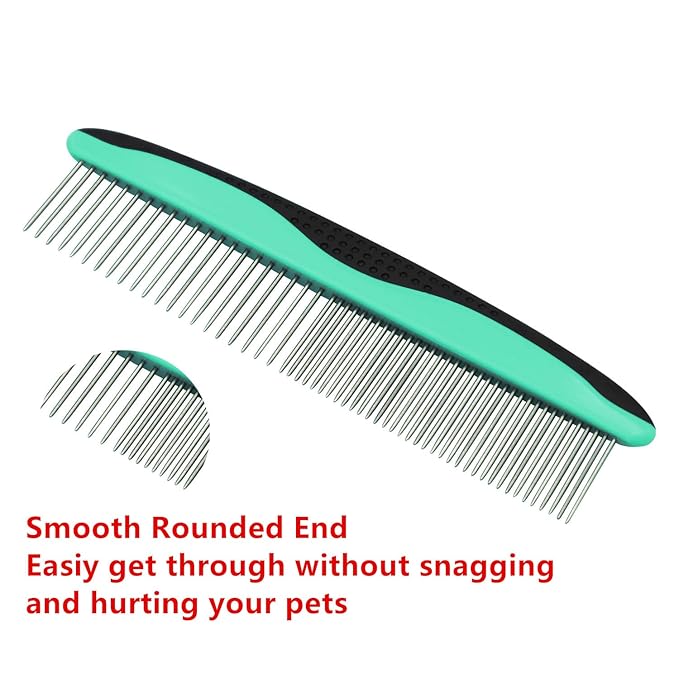 • STAINLESS STEEL PINS: with sharp teeth, this dog grooming comb features round teeth that break up tangles +effectively remove loose hair, dander & dirt trapped beneath fur.