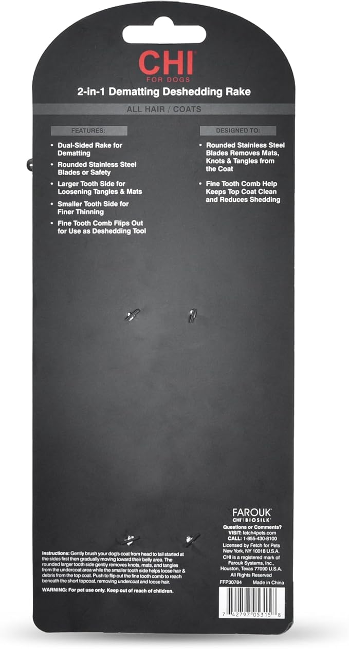 CHI for Dogs 2-in-1 Dematting Deshedding Rake, Flip-Out Fine Rake for Deshedding and Smoothing, Large Rake for Dematting Dogs; Dog Grooming Tool for Mats and Knots