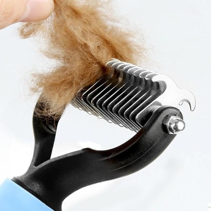- 【2-in-1 comb】 The deshedding dog brush combine cat comb for detangling, smoothing, and massaging.The wide side of the dematting comb for dogs is used to comb knot,smoothing and modeling your pet's hair, and the dense side of the dog comb is used to remove loose hair, which can be used for the pet's legs, head, around the eyes, tail or where the deshedding dog brush cannot be combed. The perfect metal comb for dogs, dematting comb for cats, deshedding tool for dogs.