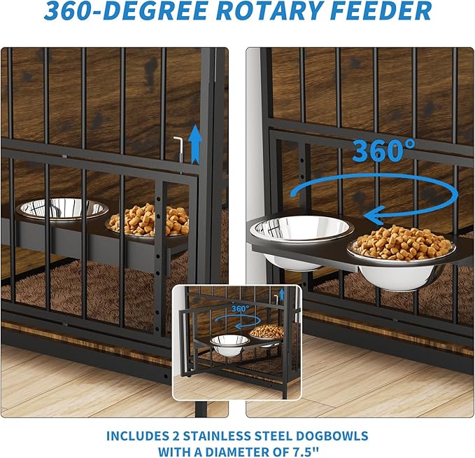 - EASY FEEDING — this dog kennel outside comes with a revolving door and 2 stainless steel dog bowls, which can be easily rotated 360° without entering the kennel to feed the dog, making meals easy and convenient. By the way, the height of the bowl can be adjusted up and down, suitable for dogs of all sizes to eat