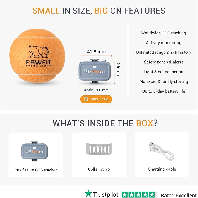 • Real-Time GPS Tracking: Connect to over 3 satellites for precise pet location tracking. Get instant updates on your Pawfit app via mobile network, with live mapping to keep an eye on your dog's every move.