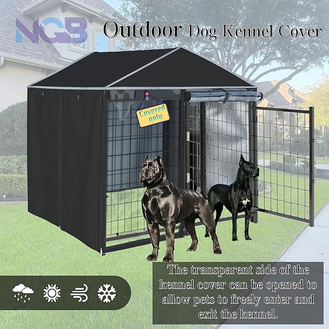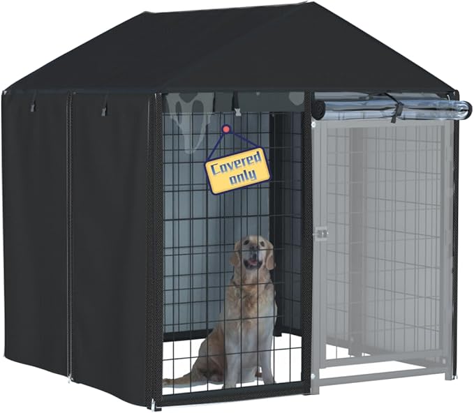 kennel cover,Full coverage kennel cover made of 600d heavy duty waterproof plus see-through clear material, outdoor wind and UV resistant, coverage only, black color.