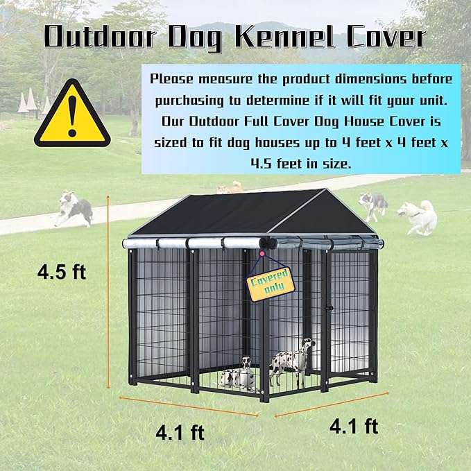 • OUTDOOR DOG KENNEL COVER: Our dog kennel cover measures 4.1'Dx4.1'Wx4.5'H. Fits most brands of dog kennels. The kennel cover is made of 600D durable oxford fabric with waterproof PU coating, which is waterproof, UV and tear resistant, which prevents rust and corrosion of the kennel and protects your investment, the full coverage kennel can provide complete protection for your pet and kennel. (Warm Tip: Only cover is provided, kennel is not included)