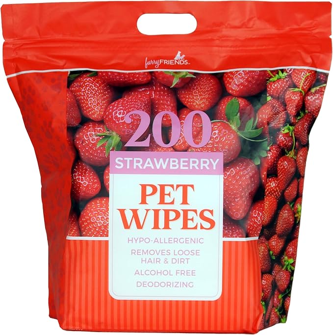 FurryFriends Pet Wipes | Strawberry | Hypo-allergenic | Alcohol Free| Deodorizing | Removes Loose Hair & Dirt | Incredibly Clean | 200 ct. 1 Pack