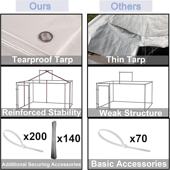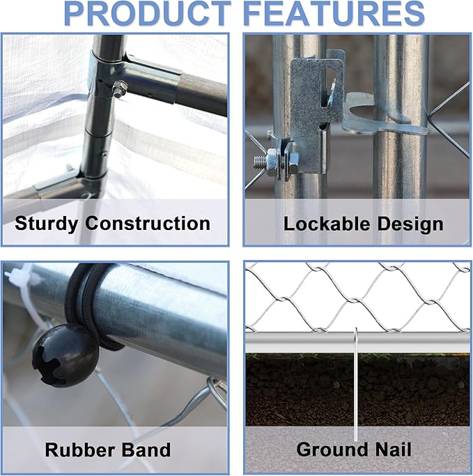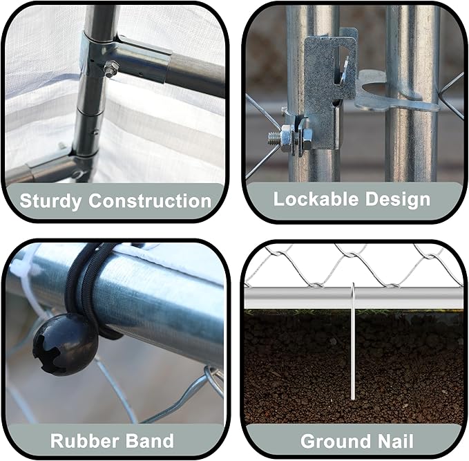 • 【Heavy Duty & Weather-Resistant Construction】This outdoor dog kennel features a galvanized metal frame that helps resist rust and corrosion, making it suitable for long-term outdoor use. The reinforced design, combined with secure cable ties and ground nails, enhances the stability of the dog crate—even for active large dogs. A solid option for outdoor protection in various weather conditions