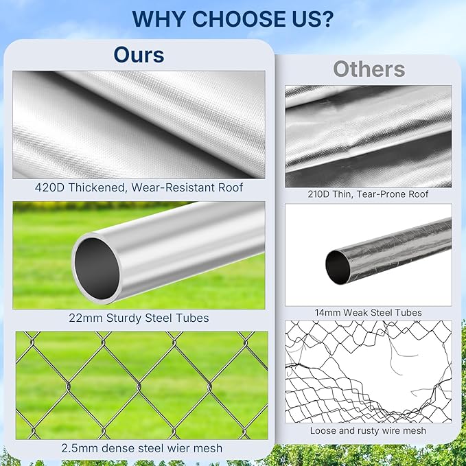 • Thickened Roof Design: This Yafylly 10x10 ft outdoor dog kennel features a thickened 420D Oxford cloth roof, which is more durable than standard kennel roofs. It is water-resistant and UV-resistant, effectively protecting your pet from harsh weather conditions and providing a safe living environment.
