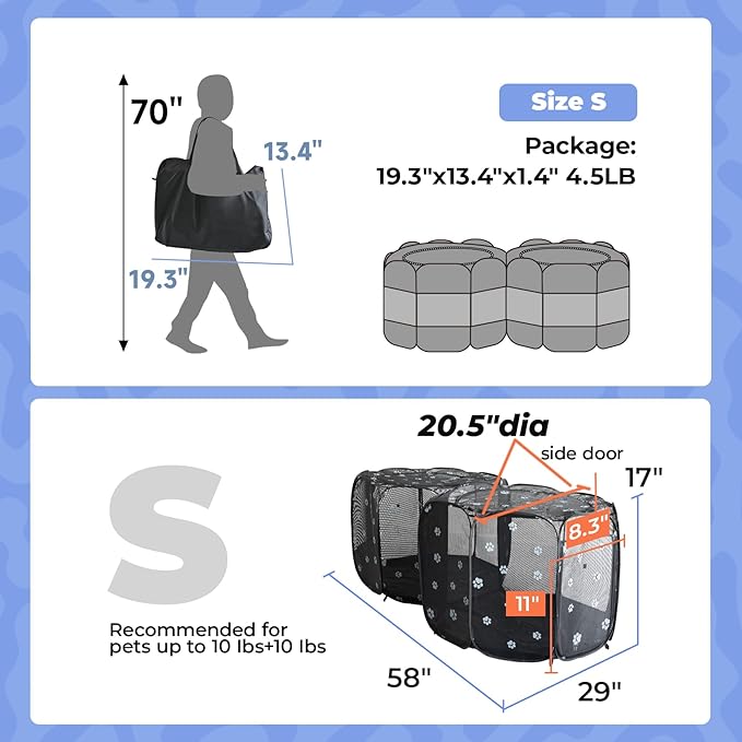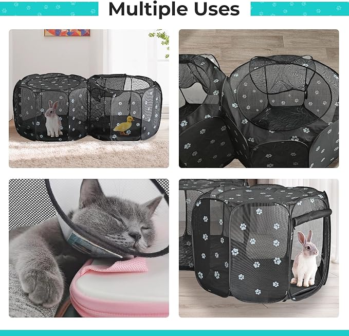 • 【Instant Setup, 2-in-1 Spacious】Pop-open rectangular or octagonal design playpen that require zero assembly – simply unfold within seconds. When need to store it, the collapsible playpen folds flat easily and stored into a compact carry case, making it ideal for indoor/outdoor use. The spacious 2-in-1 design gives more space for small animals to roam.