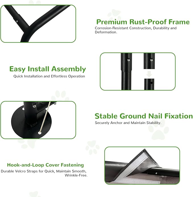 • 【Spacious & Multi-Pet Friendly】Measuring 4’x4’x3.3’, this sturdy dog shade shelter comfortably accommodates large breeds multiple small pets. The generous space allows pets to relax freely, while the durable steel frame ensures stability for active animals. Perfect for patios, yards, or farms.