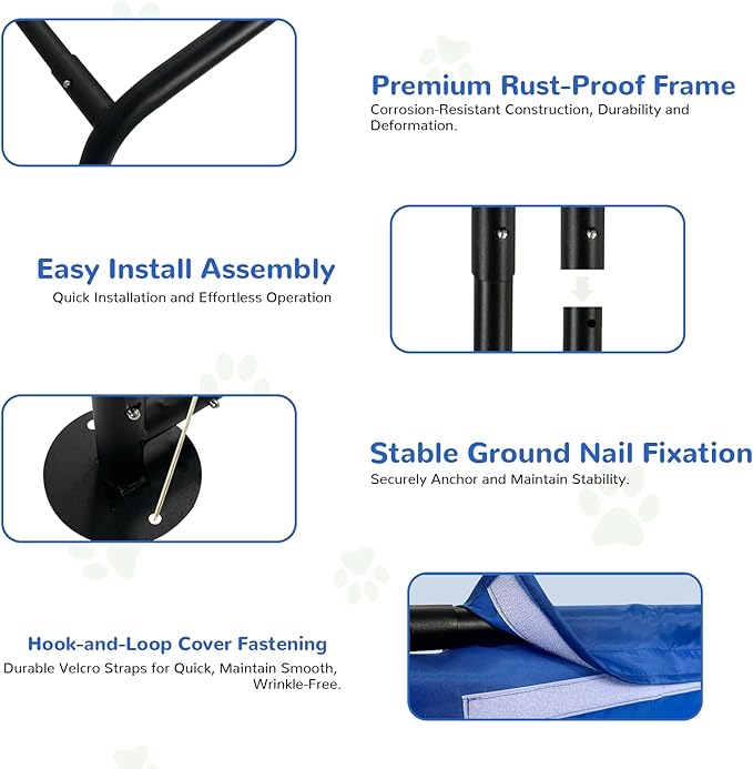 • 【Spacious & Multi-Pet Friendly】Measuring 4’x4’x3.3’, this sturdy dog shade shelter comfortably accommodates large breeds multiple small pets. The generous space allows pets to relax freely, while the durable steel frame ensures stability for active animals. Perfect for patios, yards, or farms.