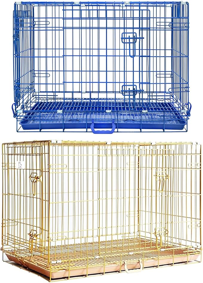 Homey Pet Dog Crates for Medium Dogs, Collapsible Small Dog Cage, Nano-Coating Metal Wire Dog Kennel Indoor with Removable Floor Grid and Tray, Double Doors Dual Locks, GOLD36+BLUE30 Bundle