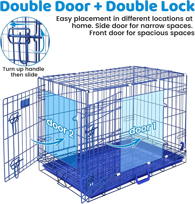 • Double Doors & Dual Locks: Featuring two large doors with low thresholds, on the front and side, for easy access. Convenient for interaction, feeding, and cleaning waste. Each door of foldable dog crate has two escape-proof slide-bolt latches that turn upward and slide to open, preventing your clever pet from escaping