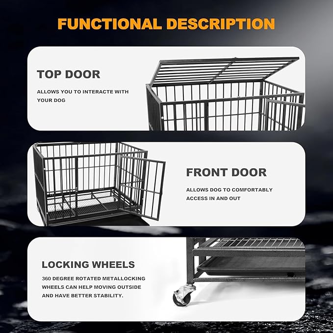 • 【Simple Setup & Mobility】With 4 lockable, 360-degree swivel wheels at the bottom, moving the dog cage around is a breeze. Lock the wheels to ensure stability and security. Most parts of the dog kennel come pre-assembled, requiring only minimal effort to complete the setup, making it a hassle-free experience for pet owners.